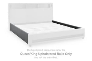 This set of queen/king upholstered rails is made with engineered wood (MDF/particleboard/plywood), decorative laminate, foam and fabric. Pairs with other items in the series to make a bed kit.