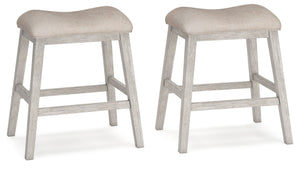 This upholstered stool invites you to raise the bar on small space living. An inspired choice for coastal chic or modern farmhouse settings, this comfortably cushioned stool sports a grayish white finish with rub-through effect for timeworn appeal.