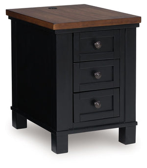 Raise the bar on modern farmhouse style with this chairside end table. Its sturdy silhouette and casual good looks are accentuated with a two-tone finish, which pairs a warm satin black base with a contrasting butcher block veneer top. Spacious storage drawers and dual USB charging ports keep devices powered up and close at hand. Whether your style is vintage, country or eclectic, this table adds a hearty element.
