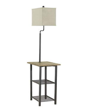 - ["Assembly required","Clean with a soft, dry cloth","2 fixed shelves","3-way switch","1 type A bulb (not included); 100 watts max or CFL 23 watts max; UL-listed","Made of metal and wood with fabric shade"]