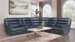 The Cheers Sectional CMS U99033M offers unparalleled comfort with its 6-piece leather-match design featuring 3 power reclining seats. Its tall 43-inch backs provide excellent support, making it an ideal choice for both style and comfort. Available in Dark bluish grey, this sectional also includes a console with USB ports and wireless charging for added convenience. Elevate your living space with this sleek and power-driven reclining sectional.