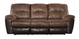 A classic split personality, this overstuffed reclining sofa is a real softie on the inside, but all business on the outside. Rest assured, the soft suede-like material is a perfect complement to the faux leather exterior giving it just the right amount of interest and character. A perfectly paired piece, comfortably priced.
