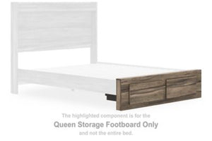 This queen storage footboard is made with engineered wood (MDF/particleboard/plywood) and decorative laminate. Pairs with other items in the series to make a bed kit.