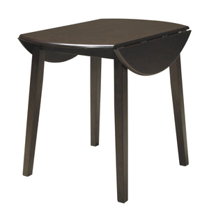 Hammis dining set sets you up for simply elegant style, even if you're tight on space. Round drop leaf table with flared legs is made of veneers, wood and manmade wood and finished in a dark brown with gray undertones. Accompanying rack back chairs are made of wood, with seat cushions upholstered in a matching dark brown vinyl, that makes a practical alternative to leather. Comfortably seats up to four.