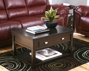 With its clean lines and chic style, this coffee table is contemporary style at its finest. Dark finish pairs nicely with brushed-nickel-tone hardware, while roomy lower shelf offers ample space and keeps tabletop free of clutter. Additional storage under lift-top surface.
