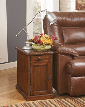 So much form and function in a beautifully compact piece of furniture. This richly styled chairside end table puts it all within reach, including a flip-up top panel revealing a power port perfect for keeping your phone or laptop charged. Hidden twin cup holders and interior shelved storage are also a welcome surprise.