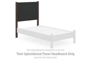 This twin upholstered panel headboard is made with engineered wood (MDF/particleboard/plywood), decorative laminate and polyester upholstery. Pairs with other items in the series to make a bed kit.