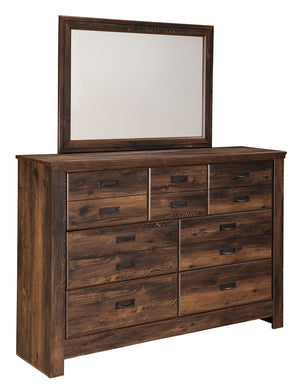 With the dark brown vintage finish flowing over replicated oak grain and framed panels with horizontal slat details, the beautiful look of the vintage designed ?Quinden� bedroom collection perfectly creates a warm inviting style that fits comfortably into the d??cor of any bedroom.