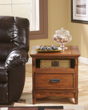 A look that's right in line with timeless Mission design. End table also marries form with functionality: an open cubby sits atop the spacious drawer. Built-in power strip increases your electrical connectivity.