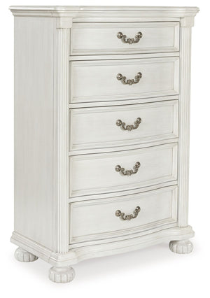 Transform your inner sanctum into a haven of timeless elegance and functionality. This traditionally styled chest of drawers is adorned in a classic antiqued white finish, highlighted by a serpentine-shaped front with thick decorative moulding. Its drawers are packed with ample storage possibilities. And did we mention the stylish reeded bun feet? Talk about relaxed refinement.