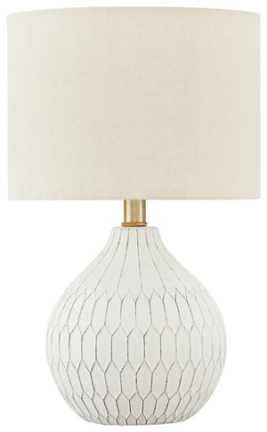 Fresh and light, the dimensional design of this delightful ceramic table lamp borrows from a retro theme to update a transitional space. Made of ceramic with an antiqued white finish, this accent lamp infuses personality into any setting. Add it to a console or end table and bring out the bright in any decor.