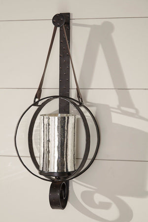 Love a rustically refined sense of style? Youre sure to be hooked on this one-of-a-kind wall sconce. Luminous mercury glass hurricane is encircled by hammered metal rings and secured by a strapping leather strap and metal wall brace.