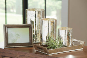 - ["Includes 3 vases, photo frame and tray","Made of mercury glass and wood","Clean with a soft, dry cloth"]