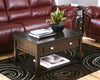 With its clean lines and chic style, this coffee table is contemporary style at its finest. Dark finish pairs nicely with brushed-nickel-tone hardware, while roomy lower shelf offers ample space and keeps tabletop free of clutter. Additional storage under lift-top surface.