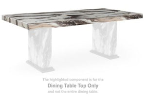 This dining table top is made with solid hardwood, decorative paper laminate and MDF substrate. Pairs with other items in the series to make a dining table.