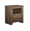Get the look of posh barn wood without setting foot in a salvage yard. Replicated rough-sawn oak of this nightstand has a vintage finish that is reminiscent of a timeworn family heirloom. Warm, rustic and naturally beautiful, its just got that ageless appeal. Sleek hardware in a pewter tone is a snappy finishing touch.