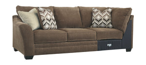 The œJustyna-Teak� upholstery sectional features a thick chenille upholstery fabric beautifully embracing the sweeping arms and plush cushions to create a casual contemporary style that is at home in any living room environment. With the reversible chaise cushion and more than enough seating for everyone, this sectional is the perfect addition to any home.
