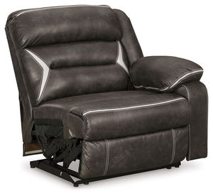 This right-arm facing power recliner is made with polyester/polyurethane upholstery. Pairs with other items in the series to make a sectional.