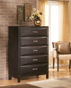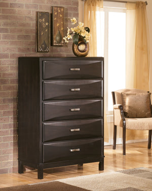 With a dark finish and exciting contemporary design, the beauty and refreshing style of the "Kira" bedroom collection creates the perfect atmosphere for the bedroom of your dreams. The almost black finish flows dramatically over the slat style headboard and shaped overlay drawer fronts to enhance the straight lined contemporary design of this bedroom collection. With aged bronzed color hardware complementing the dark finish and a stylish beveled mirror, this furniture is sure to enhance the look of any home's decor. Sleep within the rich contemporary style and comfort of the "Kira" bedroom collection.