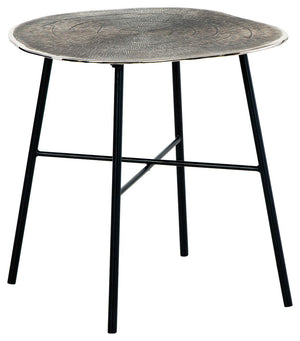 Rich with curated character, this end table puts a contemporary spin on natural beauty. Its irregular grooved top is refined with the glamour of a gleaming chrome-tone finish. A black base completes this cool piece.