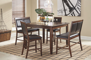 - ["Includes table, 2 upholstered chairs and 2 upholstered benches","Table made of veneers, wood and engineered wood","Wood frame chairs and benches","Cushioned backs and seats with faux leather upholstery"]