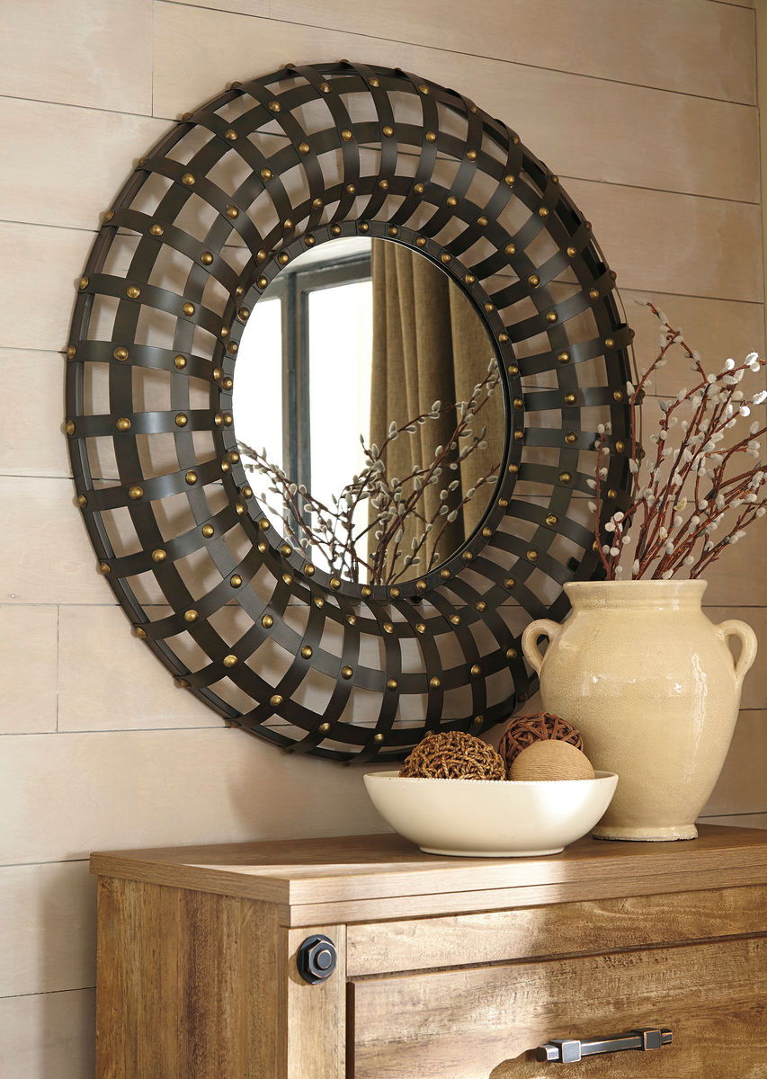 On the grid. This mirror is a cool reflection of modern industrial design. Accentuated with goldtone nailhead trim, the frames convex grid design nails the look with curvaceous refinement.