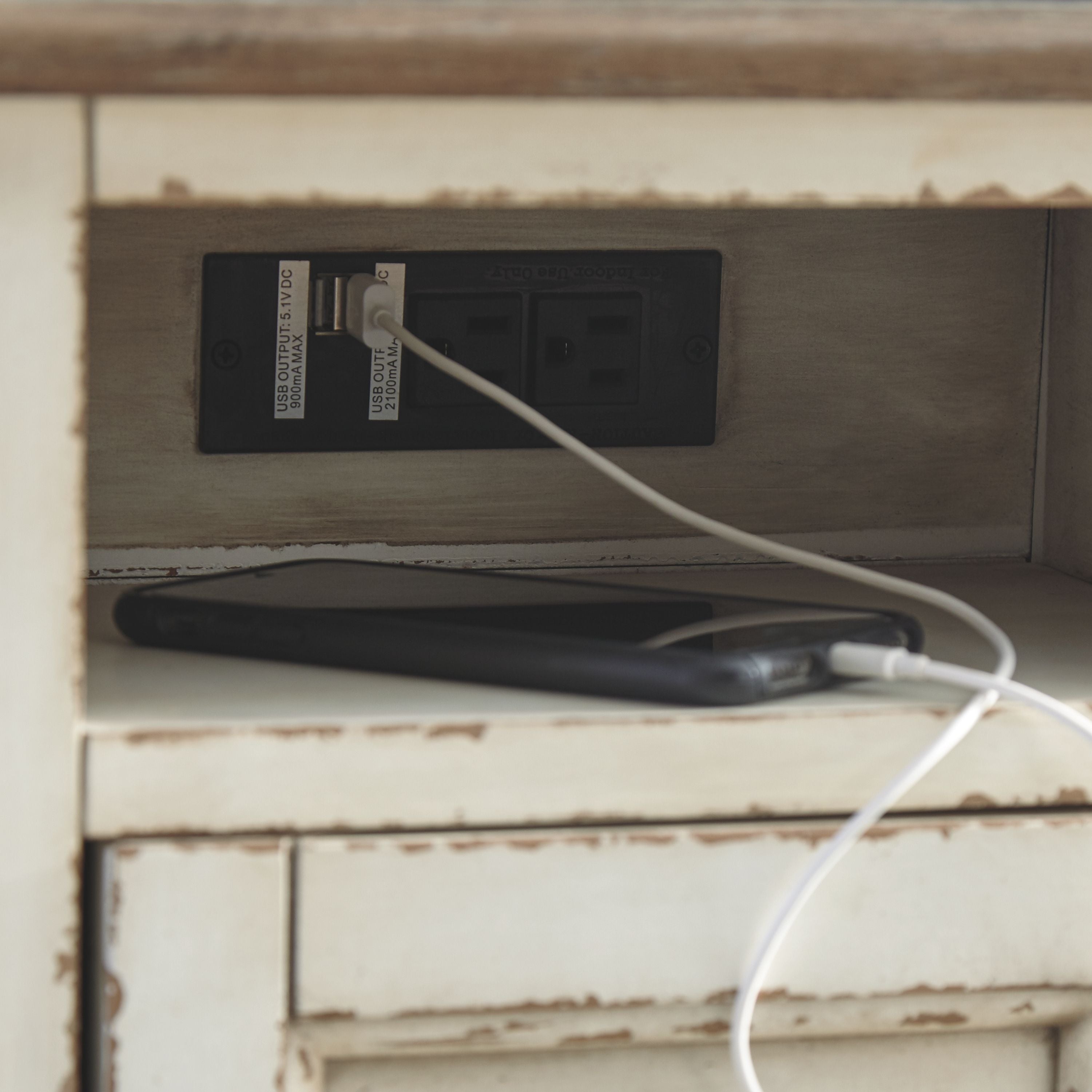 This chairside end table is traditional cottage styling made for modern living. Antiqued two-tone finish blends a chipped white with a distressed wood finished top for a double serving of charm. Cleverly placed AC power outlets and USB charging ports are beautifully in tune with your high-tech needs.