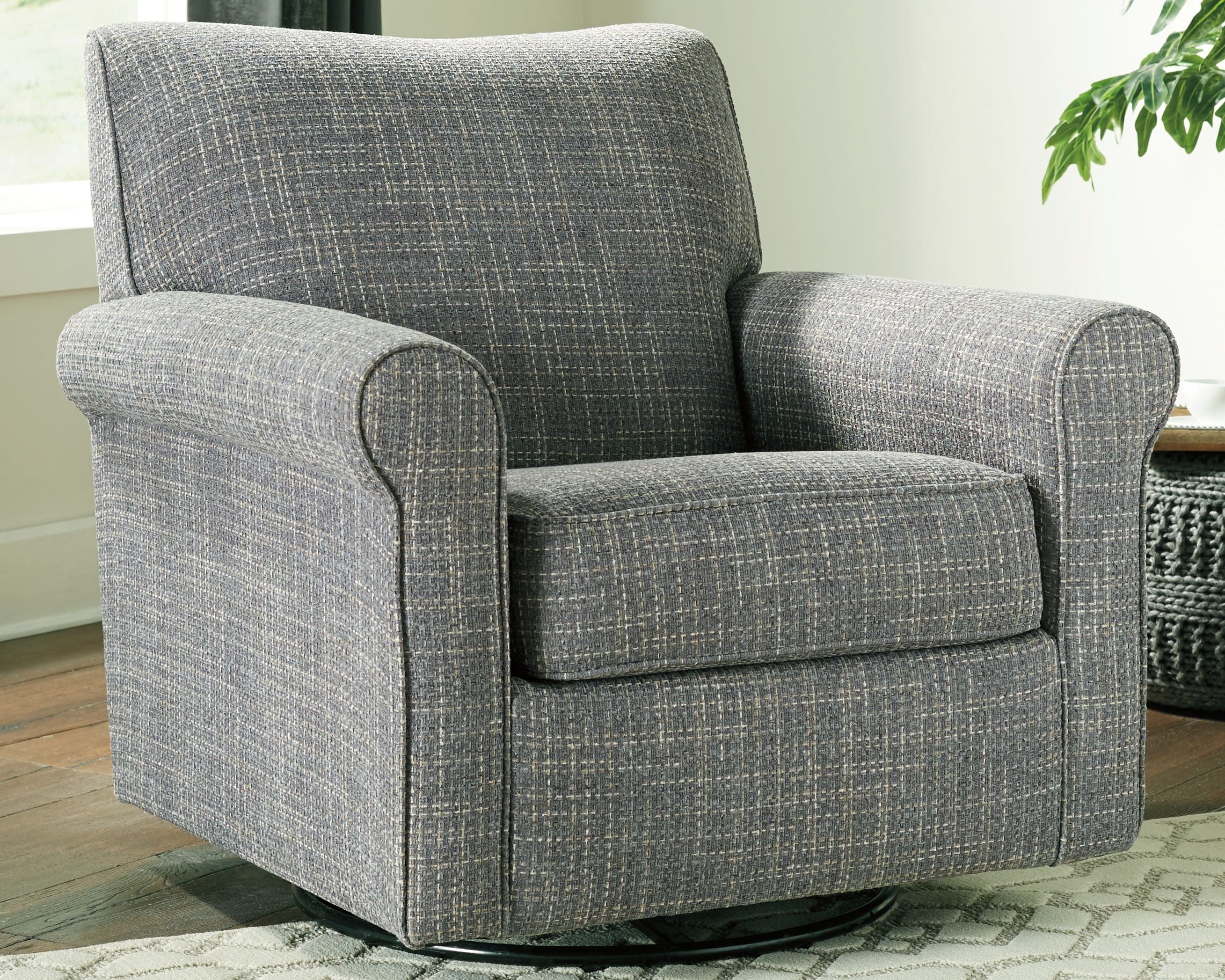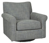 Sporting a tantalizing tweed weave fabric in such a soothing blue hue, this swivel glider accent chair gives the classic roll arm chair a modern twist. Smooth, 360-degree swivel caters to your comfort—and your viewing pleasure. Gentle glider feature is designed to rock your cares away.