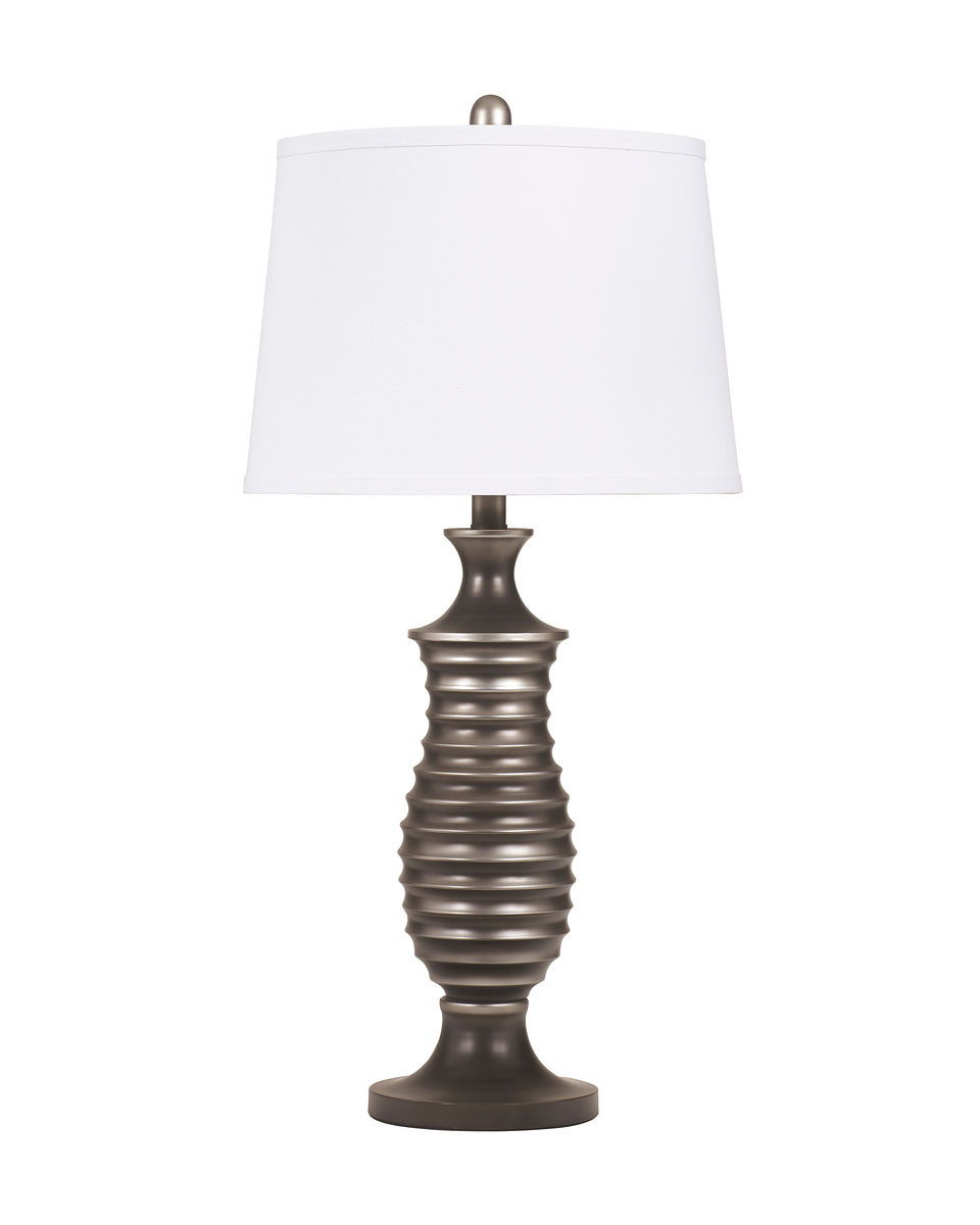 This corrugated metal table lamp has an industrial-like quality, making it at home among contemporary and eclectic decor. Bathed in an antiqued finish and topped with a fresh white shade, it's as versatile as it is stylish.