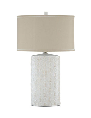 This understatedly chic ceramic lamp sports a richly texural base thats long on textural interest. Topped by a subtly shaded oval drum shade, its an illuminating take on relaxed elegance.