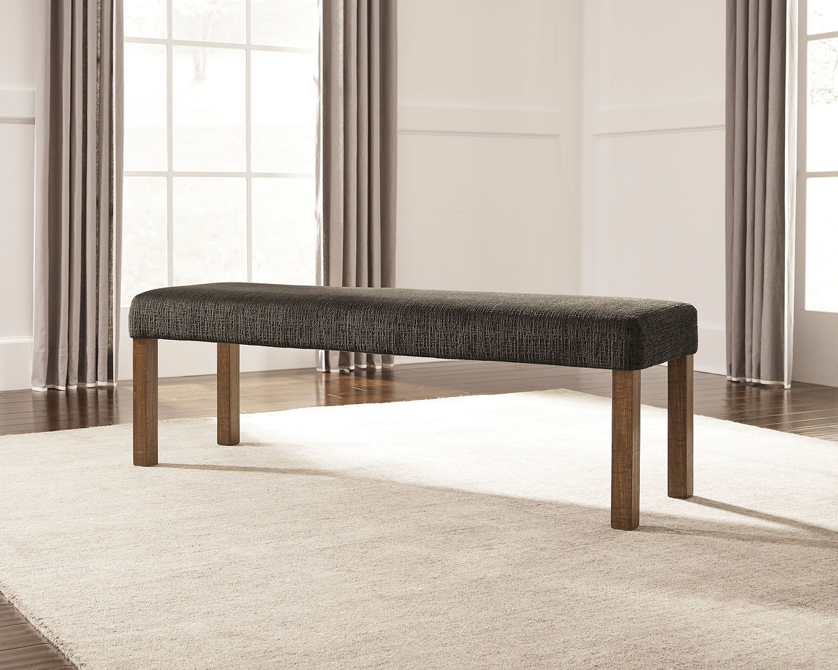 Indulge the senses with this upholstered dining room bench. Finished in a light and natural honey-tone hue, the clean-lined, blocky legs strike a pose. Highly textured with a raised meandering pattern, the richly neutral upholstery brings a fresh, organic sensibility to the table.
