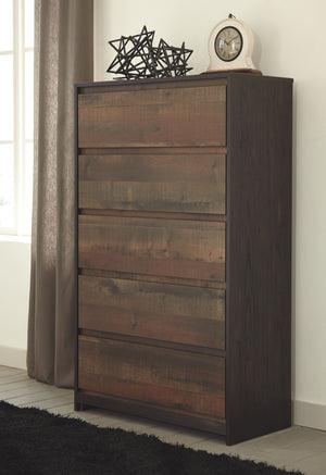 - ["Made of manmade wood with replicated oak grain finish","Two-tone finish","Plank styling","5 smooth-gliding drawers","Small Space Solution","Includes tipover restraint device"]
