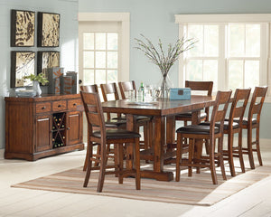 One of our most popular collections, Zappa represents the ultimate in enduring casual style and versatility. The Counter Height Set is constructed of hardwood solids and mango veneers in a lustrous multi-step medium cherry finish that will complement virtually any home interior. And this collection is built to seat all your guests with a table that extends to 108″ and easily seats eight.